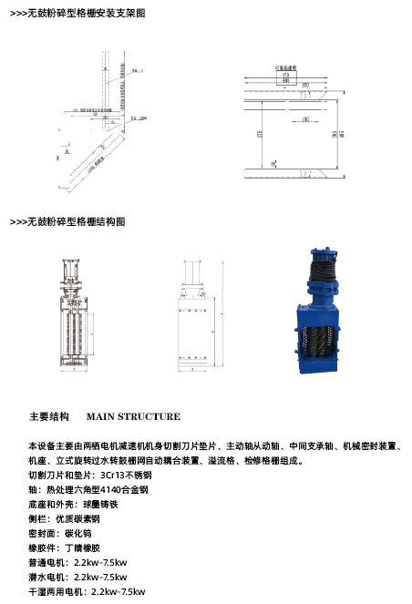 主要結(jié)構(gòu)本設(shè)備主要由兩棲電機(jī)減速機(jī)機(jī)身切割刀片墊片、主動軸從動軸、中間支承軸、機(jī)械密封裝置、機(jī)座、立式旋轉(zhuǎn)過水轉(zhuǎn)鼓柵網(wǎng)自動耦合裝置、溢流格、檢修格柵組成。
